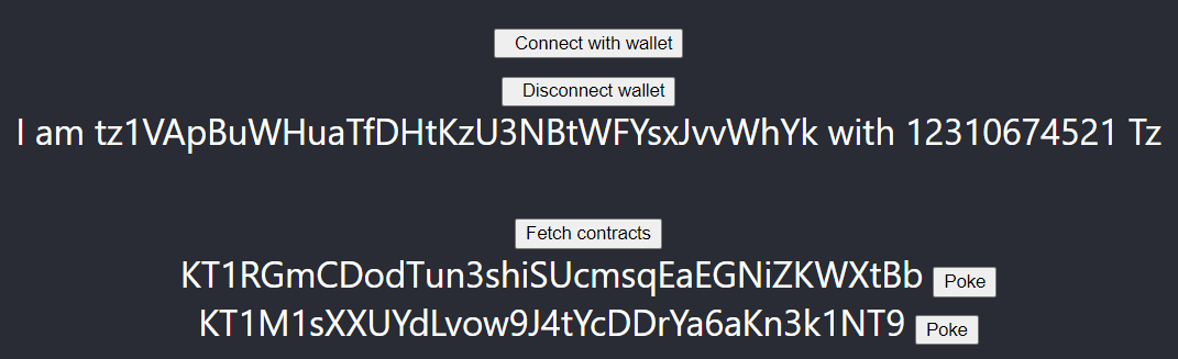 {contracts.map((contract) => <div>{contract.address}</div>)}with the one below, it adds a Poke button.{contracts.map((contract) => <div>{contract.address} <button onClick={() =>poke(contract)}>Poke</button></div>)} -